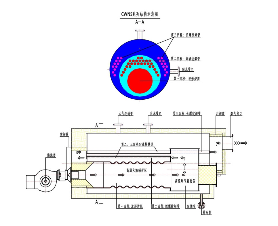 臥式內燃三回程全濕背設計,波紋爐膽,具有良好的(de)熱(rè)伸縮性(xìng),水冷回燃室(shì),回燃(rán)室與後管板扳邊對接,應力(lì)低,質量更。