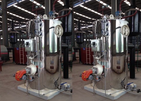 LSS型燃甲醇(醇基燃料)蒸汽鍋爐為立式快(kuài)裝內(nèi)燃三回程火管鍋爐。燃料由外界氣源進入燃燒器通過自動調節、自(zì)動點火功能產生高溫(wēn)火焰(yàn),由爐膽頂(dǐng)部進入爐膽內的密排(pái)水管內側,在爐膽下部向折180°進入爐膽與密排水管的夾層間,然後由爐膽下部煙道口折180°進入筒體與包裝層之間的肋片層,煙氣在肋片間(jiān)傳熱後由上部煙道口離開鍋爐到囪(cōng)排入大氣。鍋爐配(pèi)置(zhì)技術性能良(liáng)好燃燒器,采用了燃燒自動比例調節,給水自(zì)動調節,程序啟停,全自(zì)動運行等傑出技術,並(bìng)具有高低水位報警和極低水位、汽壓、熄火等自動保護功能。