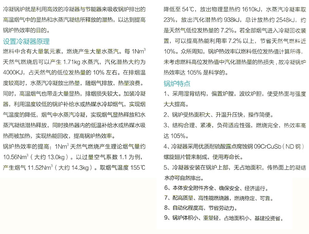 冷凝鍋爐就是利用*效的冷凝器與節能器來吸收鍋爐排出的高溫煙氣中的顯熱和水蒸氣凝結所釋放的潛(qián)熱,已達到提高鍋爐熱效率的目的。